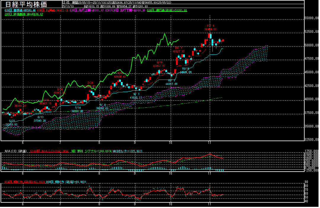 日経平均株価は前営業日比218.52円高の51281.83円で終了となり、続伸。米政府機関の一部閉鎖が終了となったことを受けて、投資家のリスク選好姿勢が強まる中、買い進められたようです。円安が進んだことも好感された模様。ただ、引き続きソフトバンクグループ(SBG)が冴えない値動きとなる中、高値は51338.89円に留まり、11日の高値(51513.16円)を上抜くことは出来ず。テクニカル的にMACDが下げ止まりの動きを見せ始める中、引き続き51000円を維持出来るか注目されます。