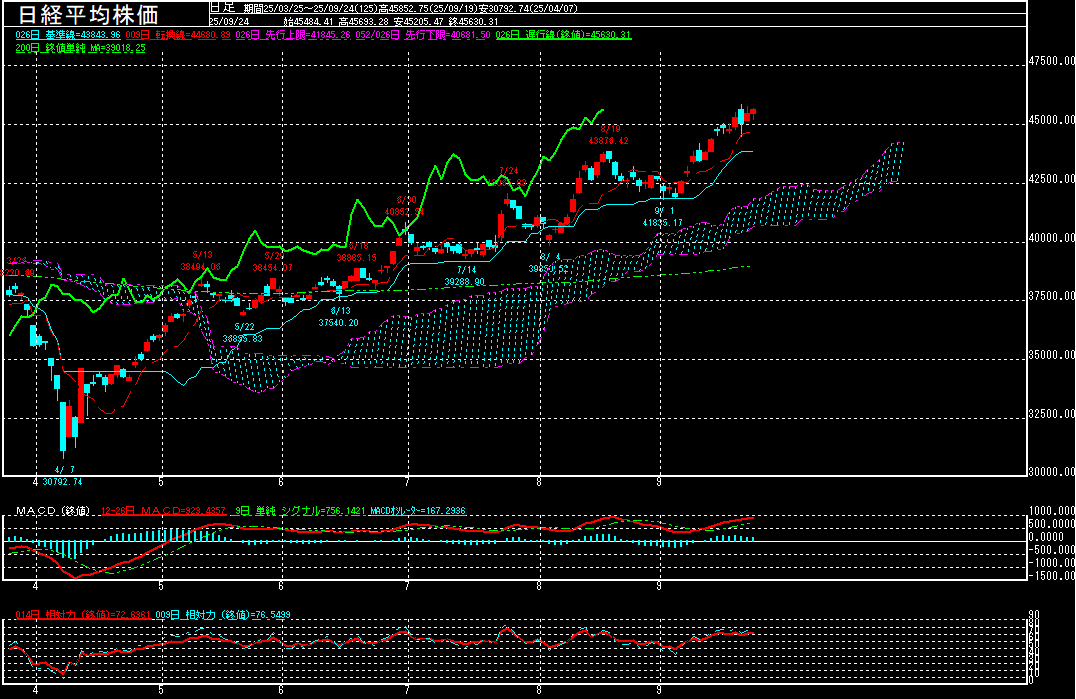 日経平均株価は前営業日比136.65円高の45630.31円で終了となり、続伸。終値の最高値を2営業日連続で更新しております。昨晩の米国市場で主要3指数は揃って反落となったものの、自民党総裁選がスタートする中、引き続き次期政権が財政拡張的な政策を進めるとの期待が株価の下支えとなったようです。米国で人工知能(AI)関連の大型投資を計画するソフトバンクグループ(SBG)が相場を牽引する中、一時45693.28円まで上昇する場面もみられております。き続き45000円台を維持しつつ、最高値45852.75円(9月19日)を上抜くことが出来るか注目されます。