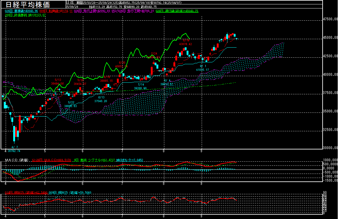 日経平均株価は前営業日比311.24円安の45043.75円で終了となり、続落。9月末の配当権利落ちに加えて、円高基調となったことが嫌気されて軟調な地合いとなったようです。一時44890.20円まで下げる場面もみられたものの、引き続き半導体関連株が買われ、株価の下支えとなる中、終値では節目の45000円を維持しております。10月4日に自民党総裁選の投開票を控える中、新政権の政策への期待から、今週も堅調な値動きが想定されます。引き続き、節目の45000円を維持出来るかが焦点となりそうです。