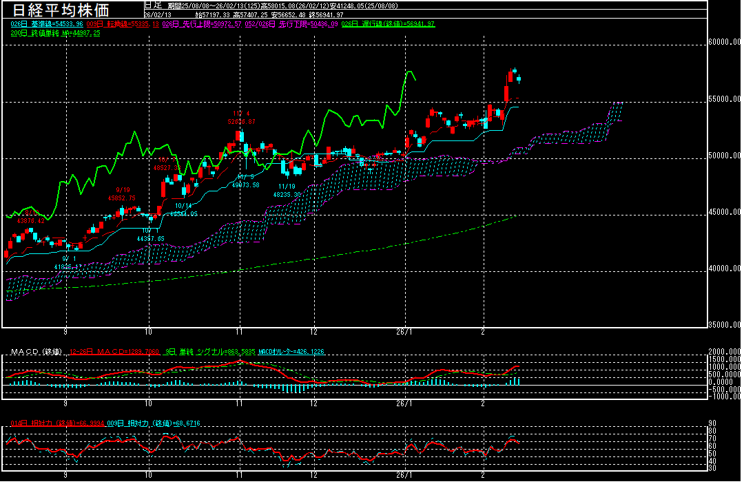 テクニカル的な買われ過ぎ感に加えて、昨晩の米国市場で人工知能(AI)の普及により既存のビジネスモデルが脅かされるとの懸念が再燃し、主要3指数が揃って続落する中、幅広い銘柄に利売りが出たようです。一時56652.48円まで下げるも、安値は買い拾われております。