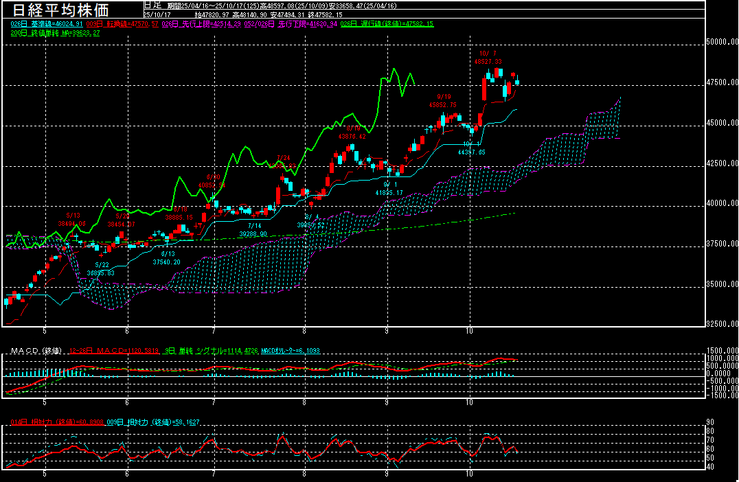 米政府機関の一部閉鎖に伴う米景気の下押し懸念や米中貿易摩擦が再燃する中、48000円付近では買い方の利喰い売りが出易くなっている模様。とは言え、日本株の先高期待はなお強く、来週21日に行われる予定の首相指名選挙で、自民党の高市総裁が首相に選出されれば、「高市トレード」が再度強まるとの見方も出ております。
