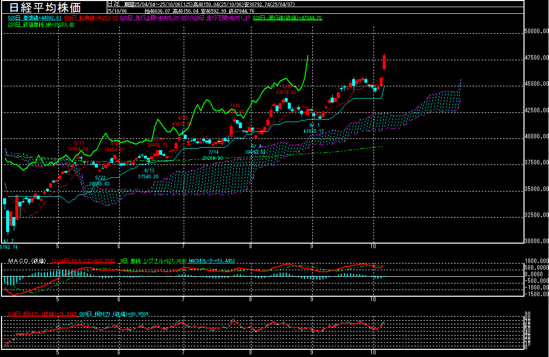 日経平均株価は前営業日比2175.26円高の47944.76円で終了となり、3営業日続伸。10月4日に行われた自民党総裁選で、高市前経済安全保障相が勝利したことを受けて、高市氏の政策スタンスを手掛かりに円安・株高が進む「高市トレード」が再開。高市氏は積極財政論者で知られていることから、財政拡張的な政策への期待が拡がり、幅広い銘柄が買い進められたようです。一時48150.04円まで上昇するなど、初めて48000円台に乗せる場面もみられております。