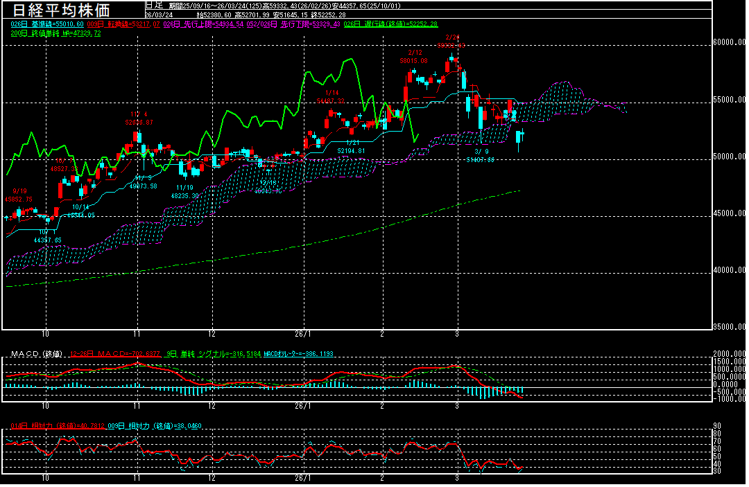 トランプ米大統領がイランの発電所への軍事攻撃を5日間延期すると表明。また、イランと停戦に向けた協議を行っていることを明らかにしたことから、中東情勢を巡る過度な懸念が。原油価格が急落したため、買い拾われたようです。東証プライムに上場する銘柄の9割超が値上がりする全面高の展開。一時52701.99円まで上昇する場面も見られております。