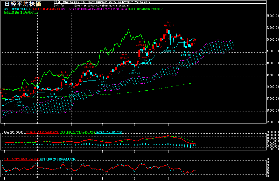 昨晩の米株式市場は感謝祭に伴い休場、今晩短縮取引となることから市場参加者が少なく、国内市場も方向感に乏しい展開となりましたが、前日に続いて50000円台を維持しております。