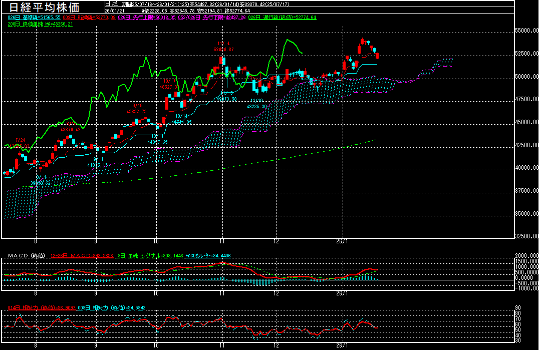 デンマーク自治領グリーンランド領有を巡り、欧米間の対立が懸念される中で、投資家のリスクオフ姿勢が強まる中、一時52194.81円まで下げる場面も見られております。ただ、5営業日続落する中で安値拾いの買いも入り始めたようで、安値からは切り返して終了しております。