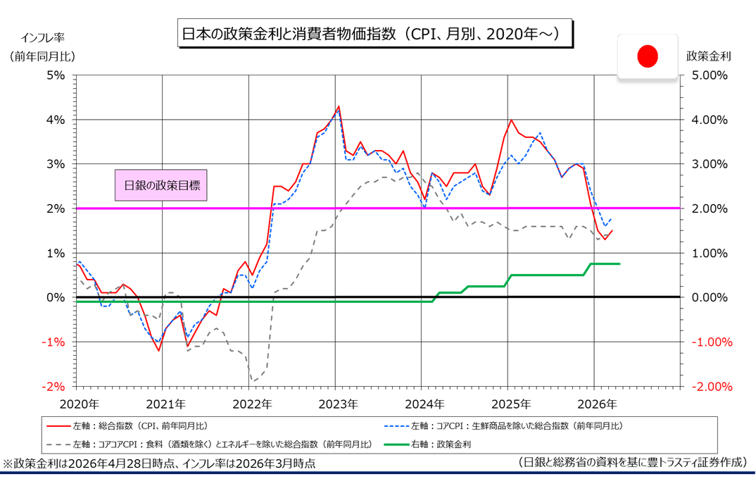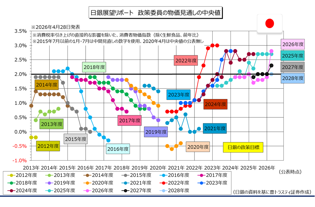 声明と同時に「経済・物価情勢の展望(展望リポート)」も公表。2026年度の消費者物価指数(生鮮食品を除く)上昇率の見通し(中央値)は原油高を受けて2.8%とし、1月時点の見通し(1.9%)から大幅に引き上げております。2027年度は2.0%から2.3%へ上方修正。2028年度は2.0%としております。一時的な要因を除く基調的な物価上昇率は、2026年度後半から2027年度にかけて2%の目標を達成するとの見方を示しております。