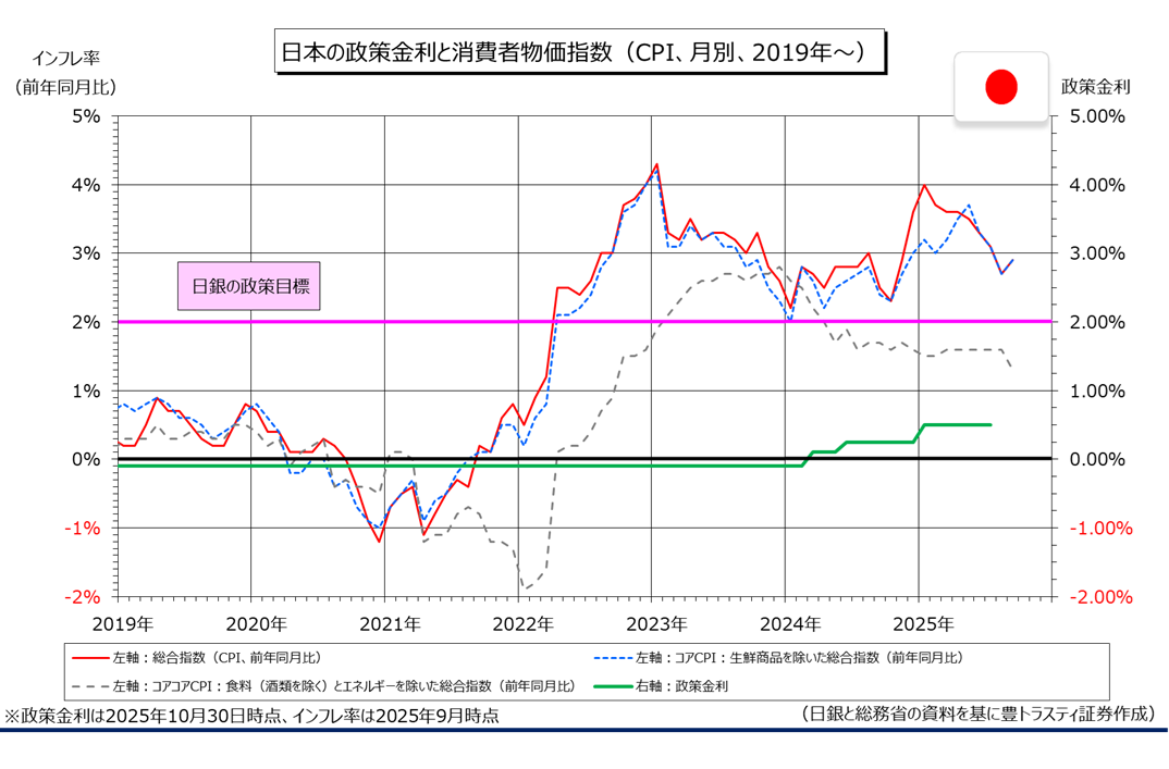 日銀は10月29、30日の両日に金融政策決定会合を開催し、短期金利の誘導目標を「0.50%程度」で据え置くことを決定しました。据え置きは3月会合以来、6会合連続。トランプ米政権による高関税政策が国内の経済・物価に与える影響を引き続き見極める必要があると判断した様です。9月の前回会合に続いて、高田・田村両審議委員は利上げを主張し、政策金利維持に反対票を投じております。なお、高市政権発足後初の会合で、政府からは城内経済財政担当相も出席。