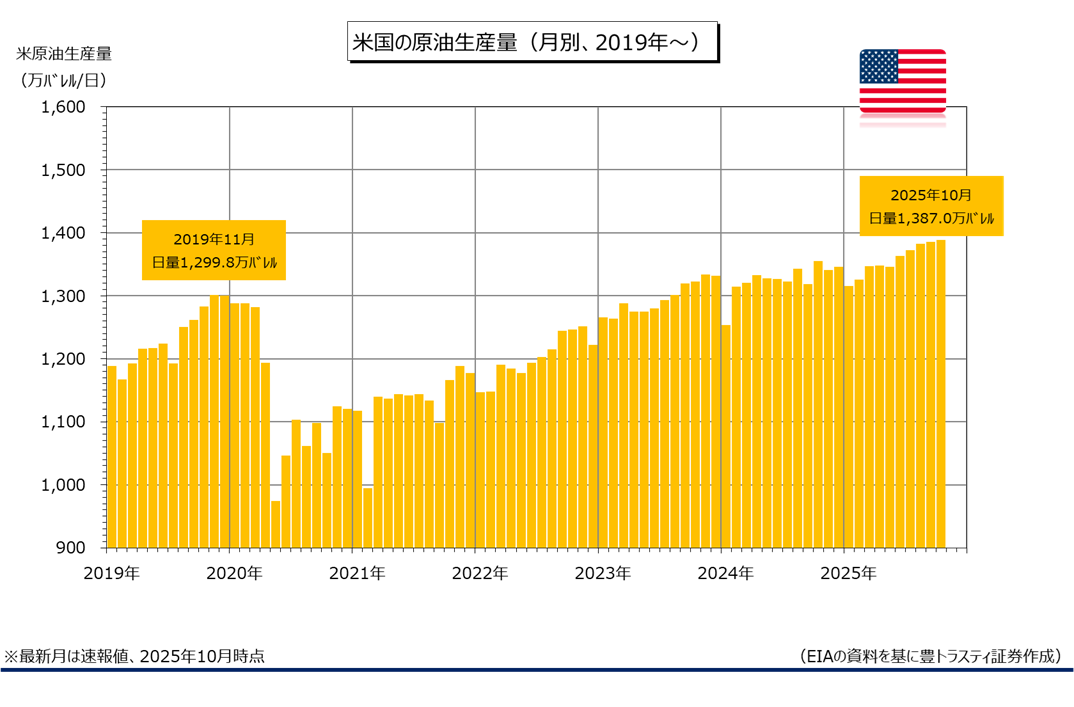 米エネルギー情報局(EIA)が昨年12月31日に公表した月報によると、昨年10月米産油量(速報値)は前月比日量3.1万バレル増加の日量1387.0万バレルと、5ヶ月連続で過去最高を更新しております。