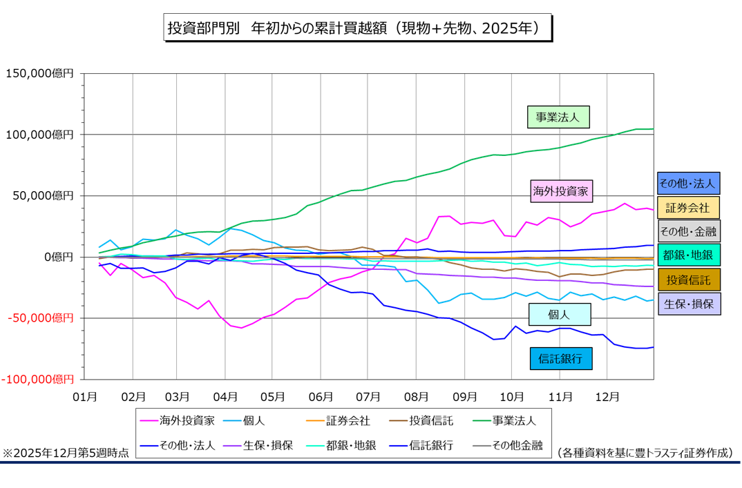 事業法人は113億円の買い越しと、14週連続で買い越しております。年初からの累計は10兆4718億円の買い越し。