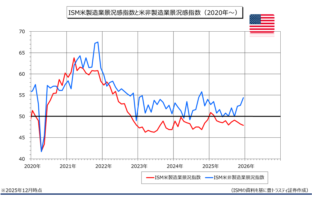 一方、1月7日に発表された昨年12月米非製造業(サービス業)景況感指数は54.4と、前月(52.6)から1.8ポイント上昇。上昇は3ヶ月連続。市場予想(52.3)も上回り、2024年10月(55.8)以来1年2ヶ月ぶり高水準となっております。景況拡大と縮小の分岐点である50は7ヶ月連続で上回っております。