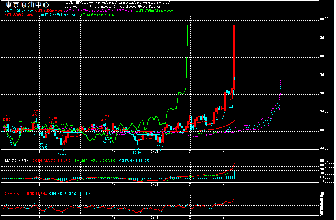 東京原油(中心限月)は前営業日比17250円高の88900円で終了。イラン情勢の一段の緊迫化を受けて、中東の「地政学リスク」が高まる中、国際原油価格が急騰。WTI原油が週明けの時間外取引で11948ドルまで急伸する中、東京原油も買い進められ、終値では2008年7月16日(90700円)以来約18年ぶりの高値を付けております。なお、上げ幅は過去最大となっております。
