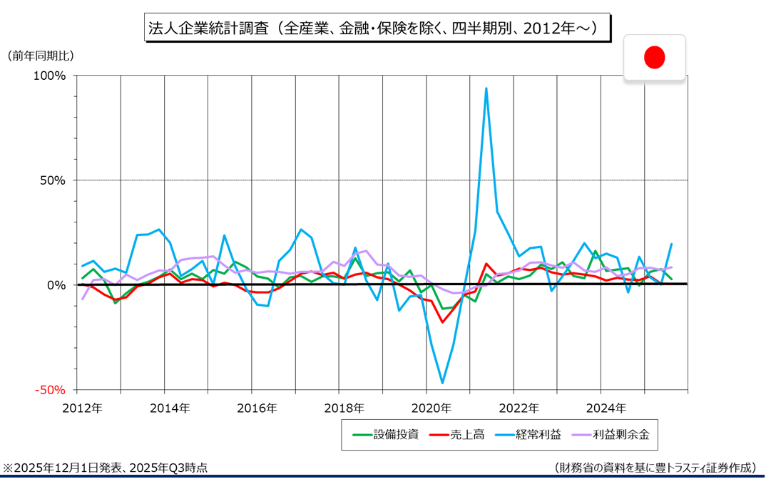 財務省が発表した2025年7-9月期法人企業統計調査によると、全産業(金融業と保険業を除く)の経常利益は前年同期比19.7%増加の27兆5385億円でした。増益は4四半期連続。人工知能(AI)や半導体関連の需要拡大が押し上げ、7-9月期としては過去最高となっております。