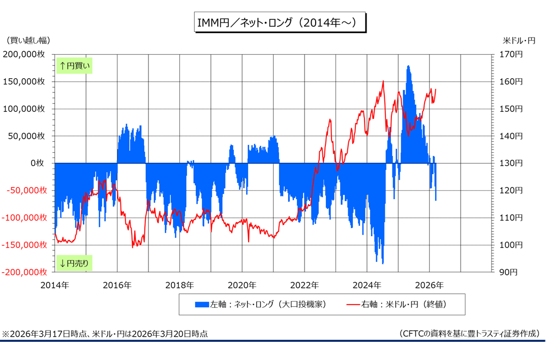 なお、米商品先物取引委員会(CFTC)のデータによると、大口投機家のIMM通貨(円)のネット・ロングは3月17日時点で前週比2万6393枚減少のマイナス6万7780枚と、4週連続で減少。3週連続でネット・ショートとなっております。