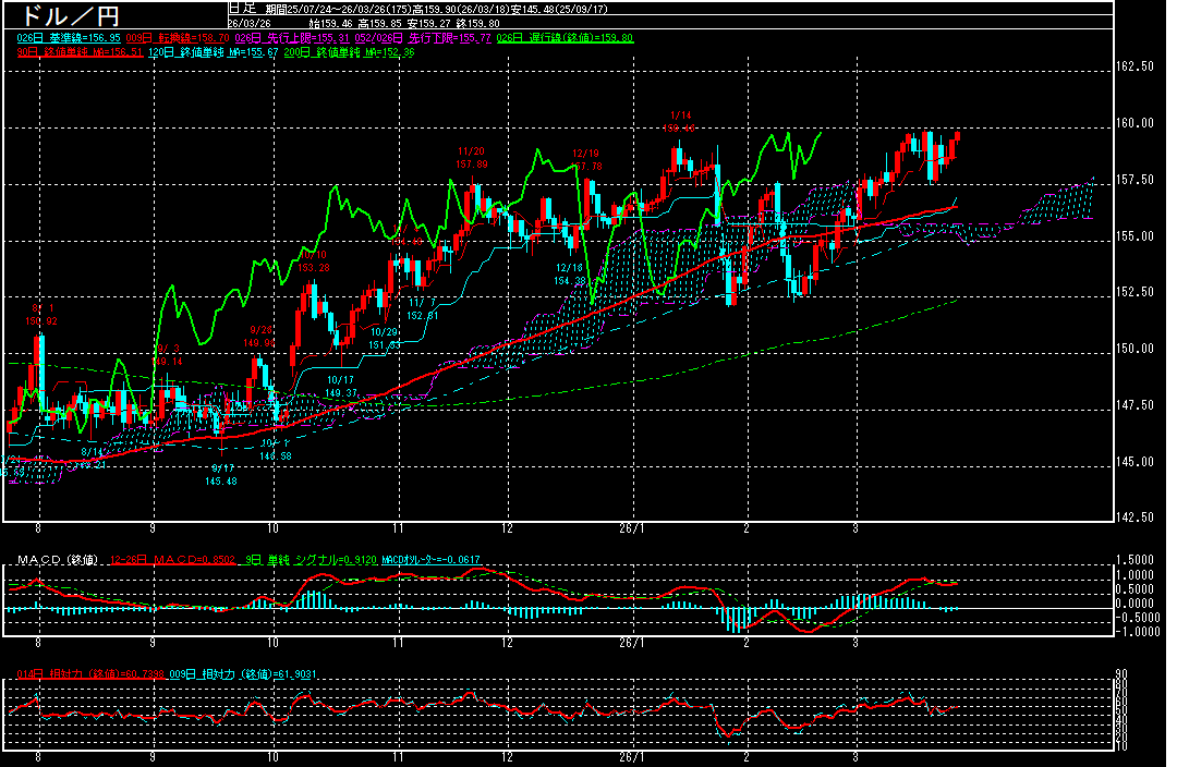 米ドル・円は、イラン情勢の緊迫化を受けた「有事のドル買い」の動きが続く一方、政府・日銀による円買い介入への警戒感が強まっていることから、159円を中心とした狭いレンジで推移しております。