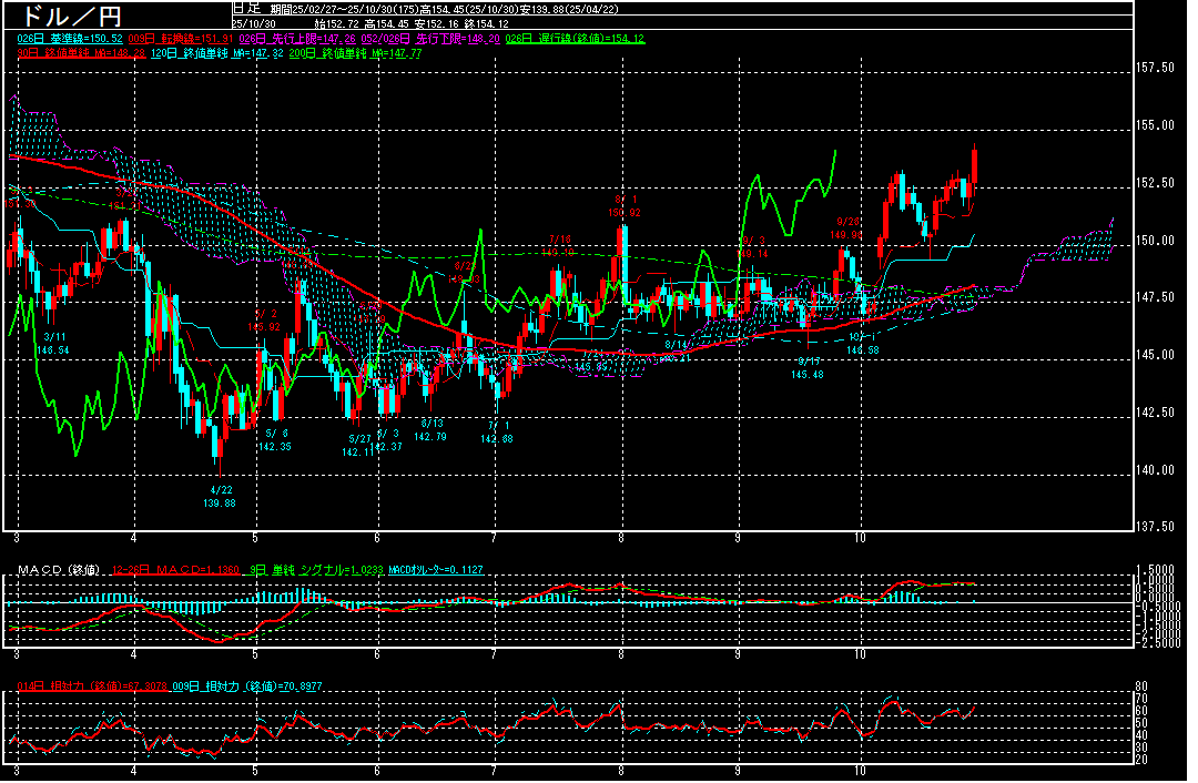 一方で、日銀は金融政策会合で政策金利の据え置きを決定。記者会見で植田総裁は追加利上げについて「現時点で予断を持っていない」と発言。日銀が追加利上げを急いでいない姿勢を示したとの見方が拡がる中、日米金利差の縮小観測が後退。円売りドル買いが加速する中で30日に10月10日の153.28円を上抜いて一時154.45円まで円安が進み、2月12日以来の154円台に乗せてきております。