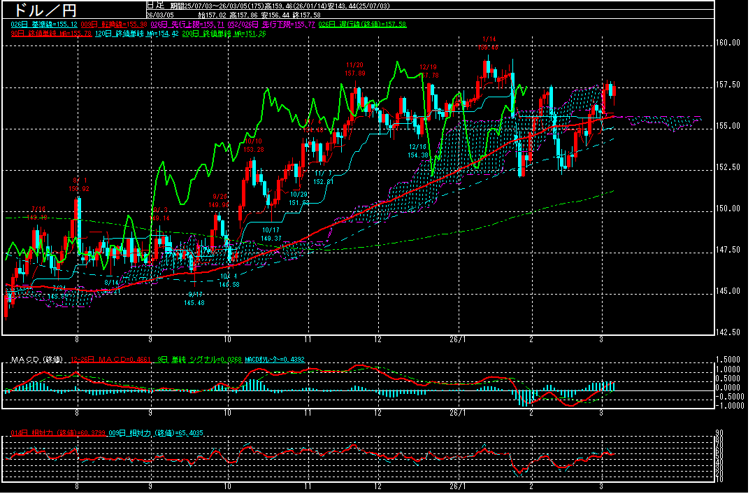 テクニカル的にもMACDが上昇基調を強めているだけに、2月9日の157.66円を上回って推移するようですと、「Wボトム」型が意識されそうです。その場合、1月14日の159.46円を意識した動きになって行くことも想定されます。
