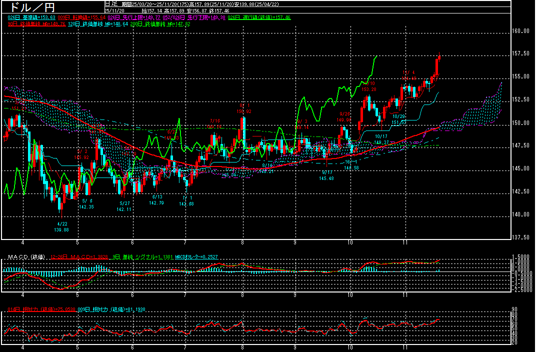 18日に高市首相が就任後初めて植田日銀総裁と会談。翌19日に片山財務相と城内経済財政相が植田総裁と会談し、片山財務相は会合後に「市場の動向に対しては高い緊張感を持って注視する」としつつ、「為替については具体的な話は出なかった」と述べたものの、円安阻止に向けた強い姿勢が示されなかったことから、政府・日銀による為替介入への警戒度が後退。20日に157.89円まで円安が進む場面もみられております。