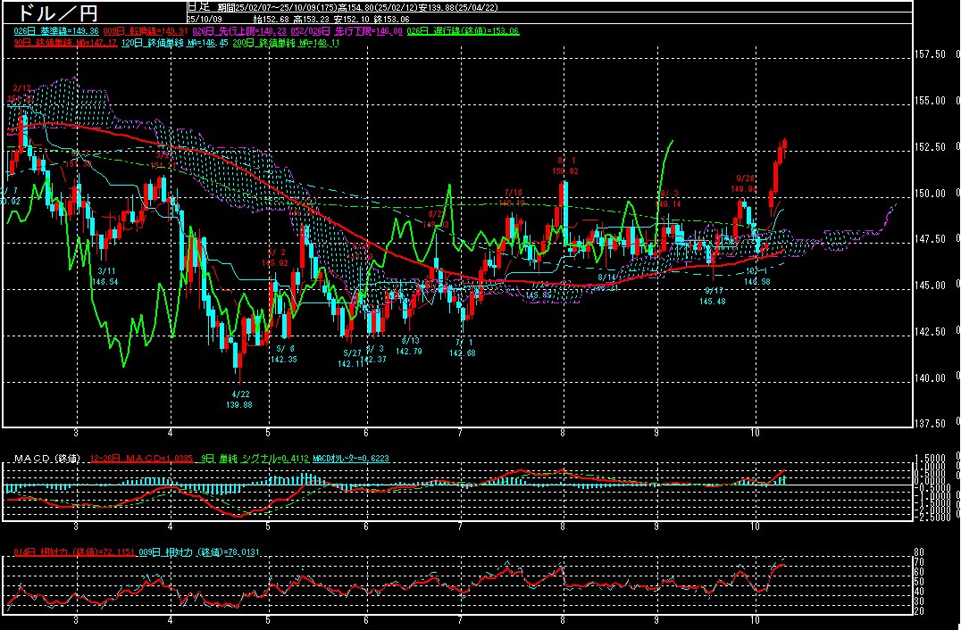 一方で、公明党の連立離脱論が出ており、政局の不透明化が強まれば、「高市トレード」の巻き戻しで円が買い戻されるとの見方も出ております。今週は約6円近く円安が進んだだけに、短期的に10月1日の146.58円から10月9日の153.23円の上げ幅をフィボナッチ・リトレースメントで見た場合の半値押し水準149.91円や節目の150円辺りまで下げて来ることも想定されます。