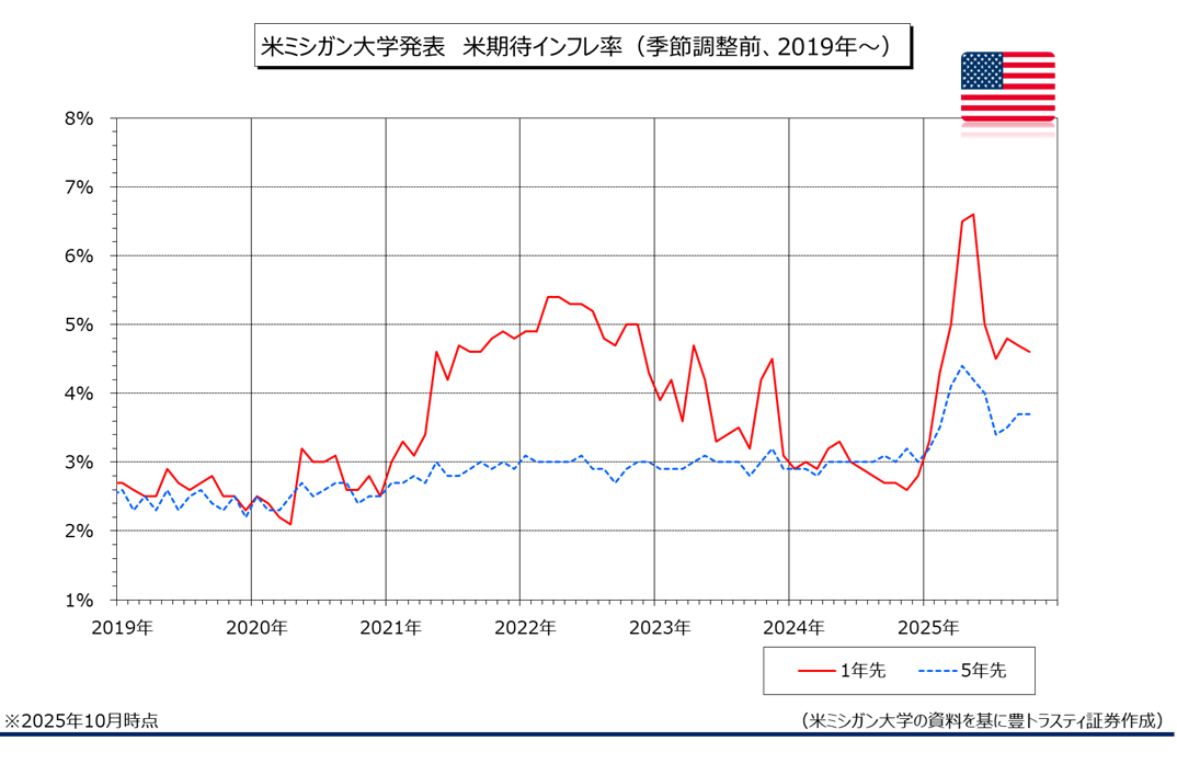 なお、中期的な見通しを示す3年先の期待インフレ率は3.05%(前月は3.00%)と、4月(3.17%)以来の高水準。長期的な見通しを示す5年先の期待インフレ率は2.97%(前月は2.93%)と、2月(2.98%)以来の高水準となっております。いずれもFRBが物価目標とする2%を上回る水準が続いております。