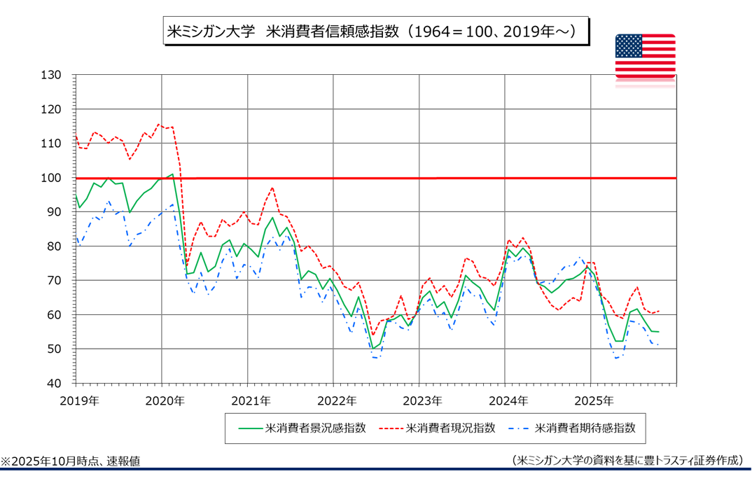 米ミシガン大学が10月10日に発表した消費者調査によると、10月米消費者態度指数(暫定値)は55.0と、前月(確報値、55.1)から低下。3ヶ月連続で低下となり、5月(52.2)以来の低水準となったものの、市場予想(54.0)は上回っております。現況指数は61.0(前月は60.4)、期待指数は51.2(前月は51.7)でした。