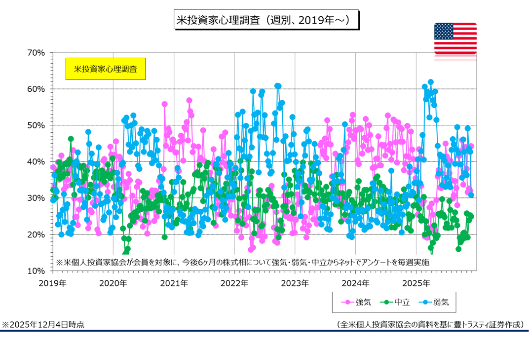 米個人投資家協会(AAII)が公表した週報によると、今後6ヶ月の株価見通しに「強気」と答えた割合は12月4日時点で44.3%と、前週比12.3ポイント上昇しております。