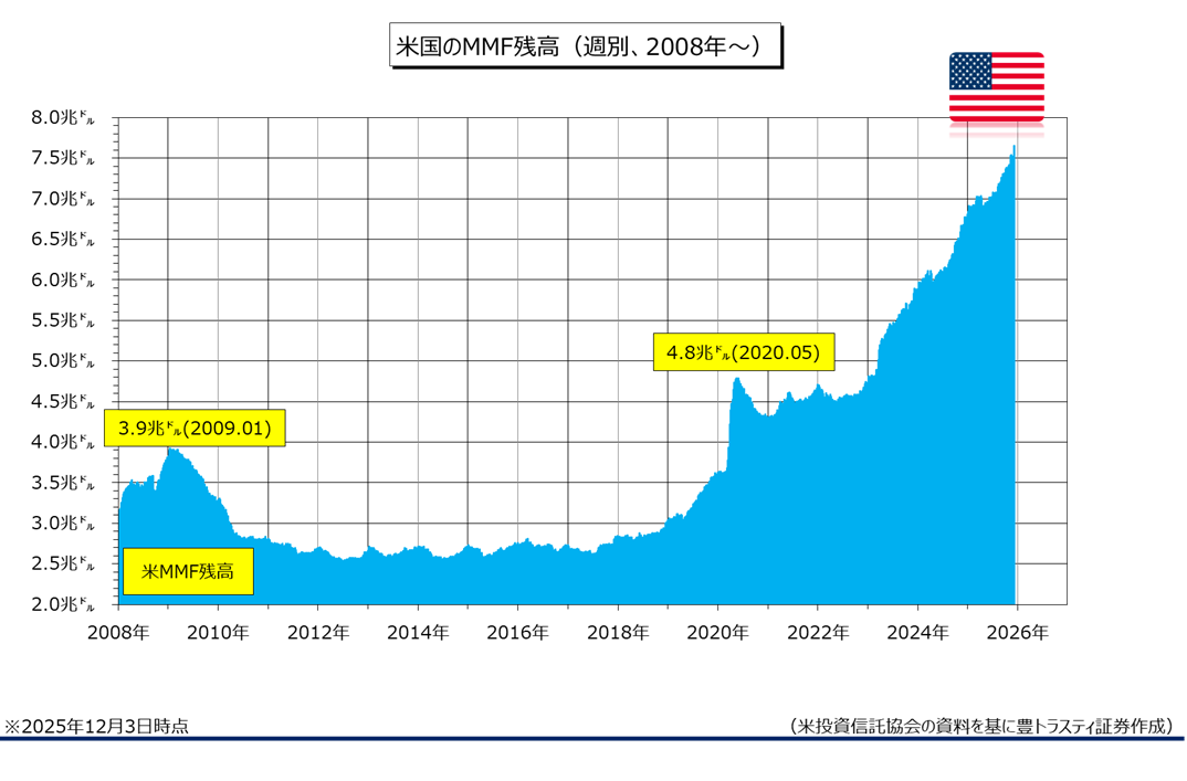 米投資信託協会(ICI)によると、12月3日時点の米マネー・マーケット・ファンド(MMF)全体の純資産残高は前週比1323.30億ドル増加の7兆6539億ドルと、増加に転じております。