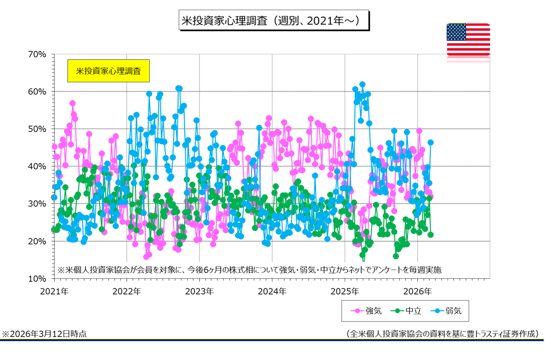 米個人投資家協会(AAII)が公表した週報によると、今後6ヶ月の株価見通しに「強気」と答えた割合は3月12日時点で31.9%と、前週比1.2ポイント低下。6週連続で低下しております。