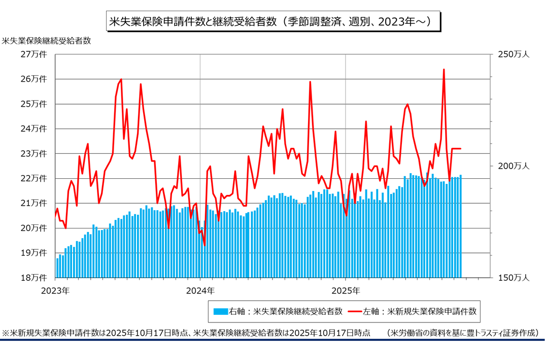 米失業保険継続受給者数は195.7万件と、米政府機関の一部閉鎖前に発表された9月13日までの週(191.6万件)から大幅に増加。8月初旬以来の高水準となりました。