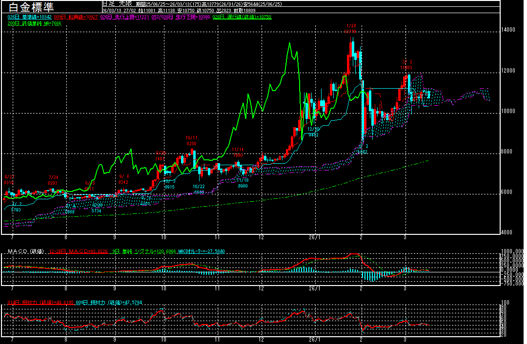 白金標準(期先)は前営業日比246円安の10750円で終了となり、続落。引き続き一目均衡表の雲の上限でレジスタンスを受けたようで、上値の重い展開となっております。引き続き、一目均衡表の雲の下限を維持出来るかが焦点となりそうですが、下抜けるようだと10000円割れを試すことも想定されます。