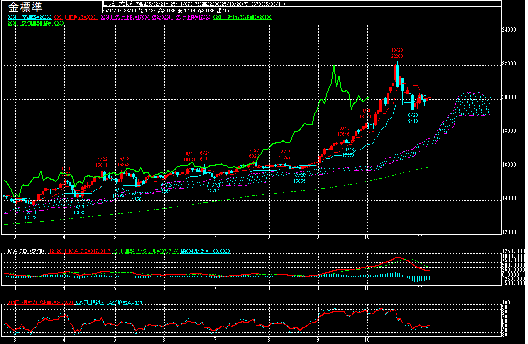 金標準(期先)は前営業日比132円高の20045円で終了となり、3営業日ぶりに反発。一時20083円まで上昇するなど、20000円を回復しております。MACDが下げ止まりの動きを見せ始める中、引き続き20000円を維持出来るか注目されます。