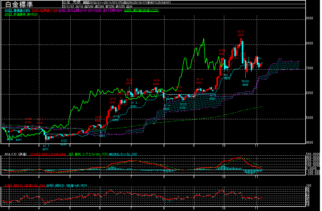 白金標準(期先)は前営業日比133円高の7231円で終了となり、3営業日ぶりに反発。ただ、高値は7250円に留まり、前日の高値7252円を上抜くことは出来ず。ペナントを形成し始める中、MACDは下げ止まりの動きを見せ始めております。不安定な値動きは続きそうですが、再度7500円超えを試す展開となって行くか注目されます。