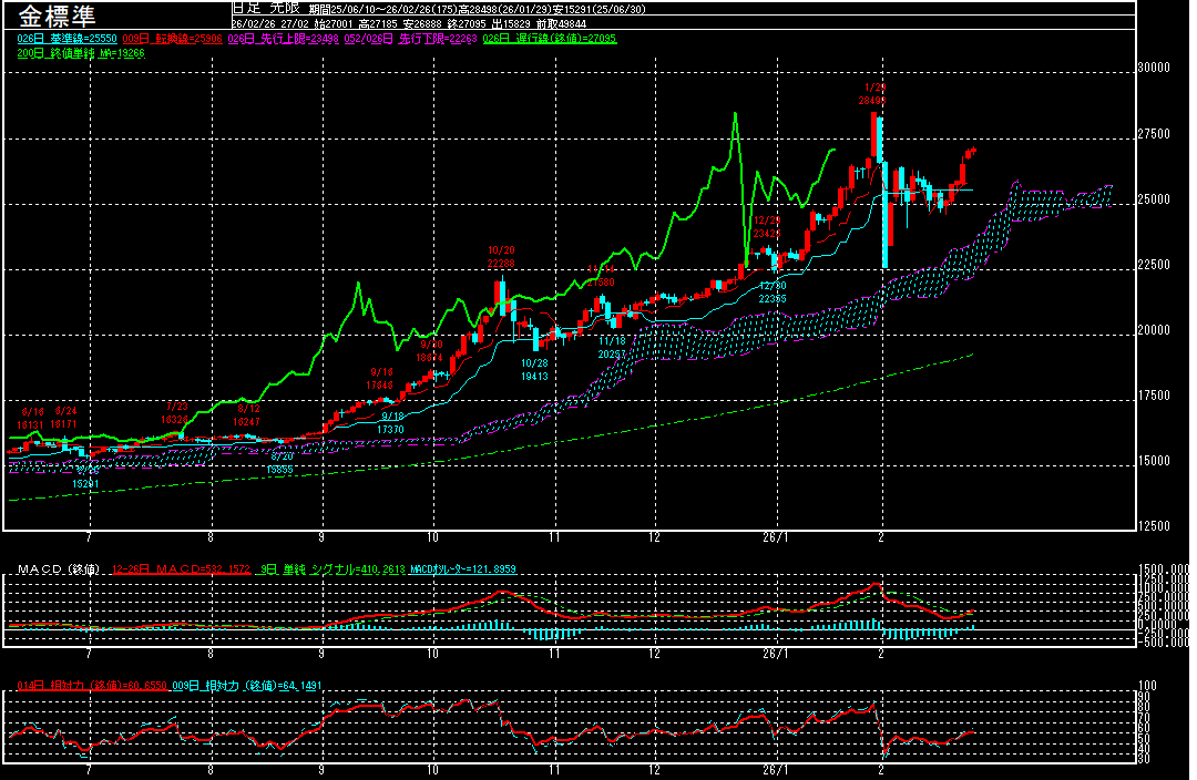 相対力指数(RSI)は60%と相場の過熱感はまだ無いように見えますが、急ピッチな上昇に対する警戒感も出始めているようです。MACDはゴールデン・クロスを維持しているだけに、安値は引き続き買い拾われそうですが、2月2日を起点としたアップ・トレンドを形成しつつ、次の節目27500円を意識した動きが続くか注目されます。