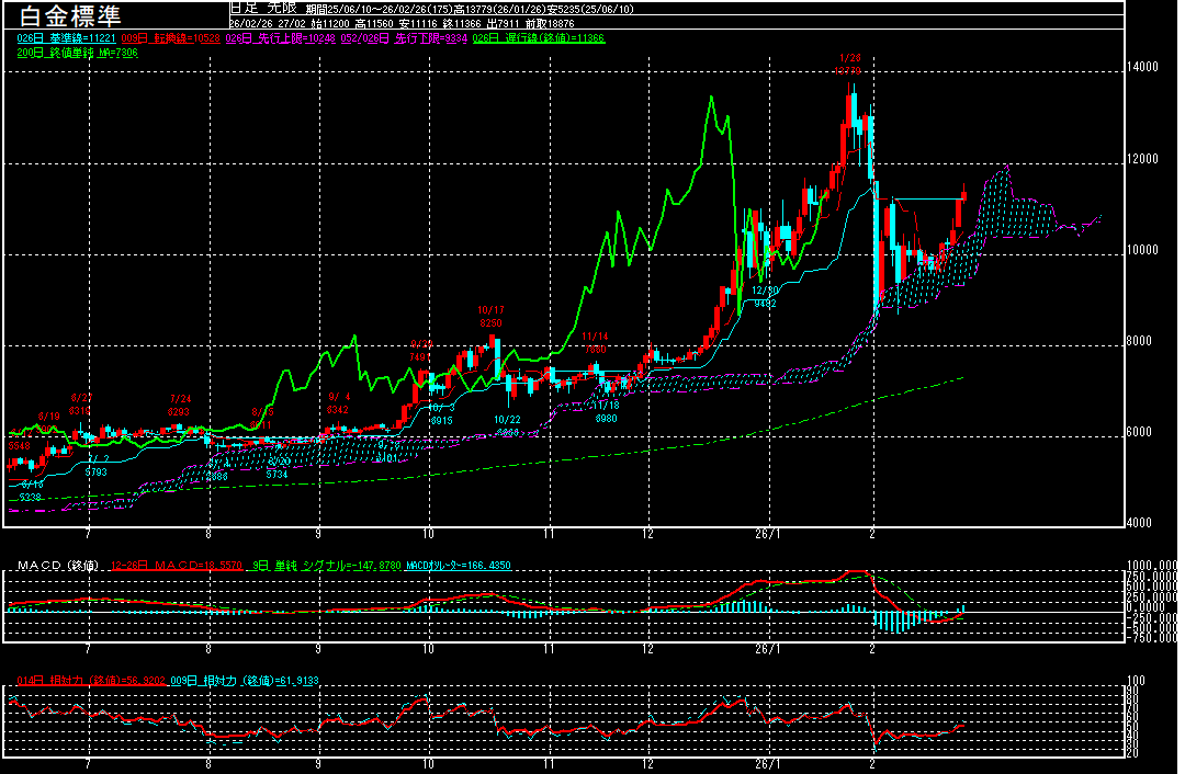 白金標準(期先)は前営業日比171円高の11366円で終了となり、6営業日続伸。前日の高値11206円や1月26日の高値13779円から2月2日の安値8662円の下げ幅をフィボナッチ・リトレースメントで見た場合の半値戻し水準11221円を上抜いて、一時11560円まで上昇する場面も見られております。