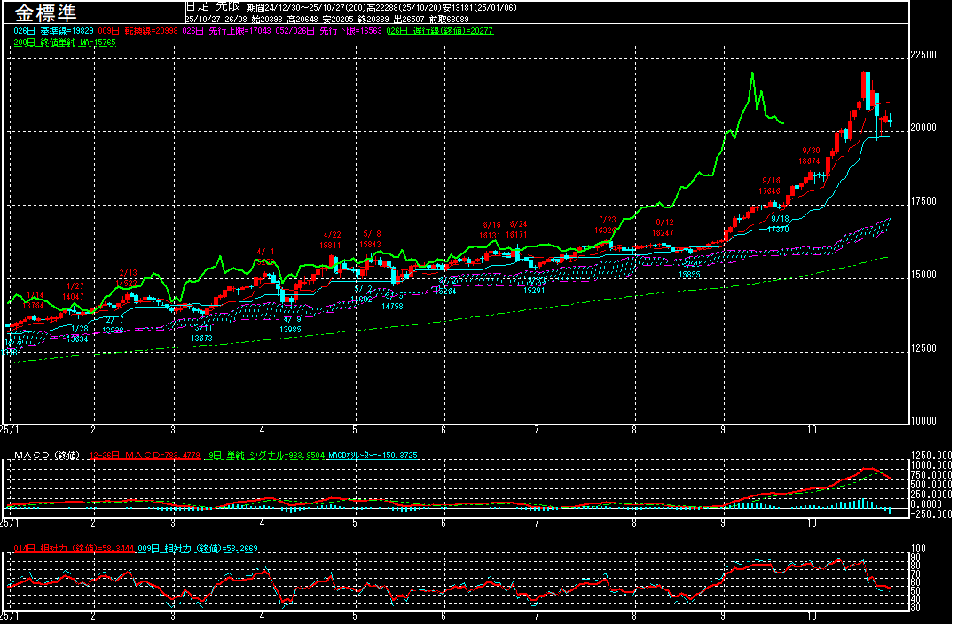 金標準(期先)は前営業日比183円安の20339円で終了となり、反落。一時20205円まで下げる場面もみられております。20日に大陰線を引いたことで上値の重さが意識され始める中、MACDもデッド・クロスとなったことから、上昇一服感が強まっているようです。