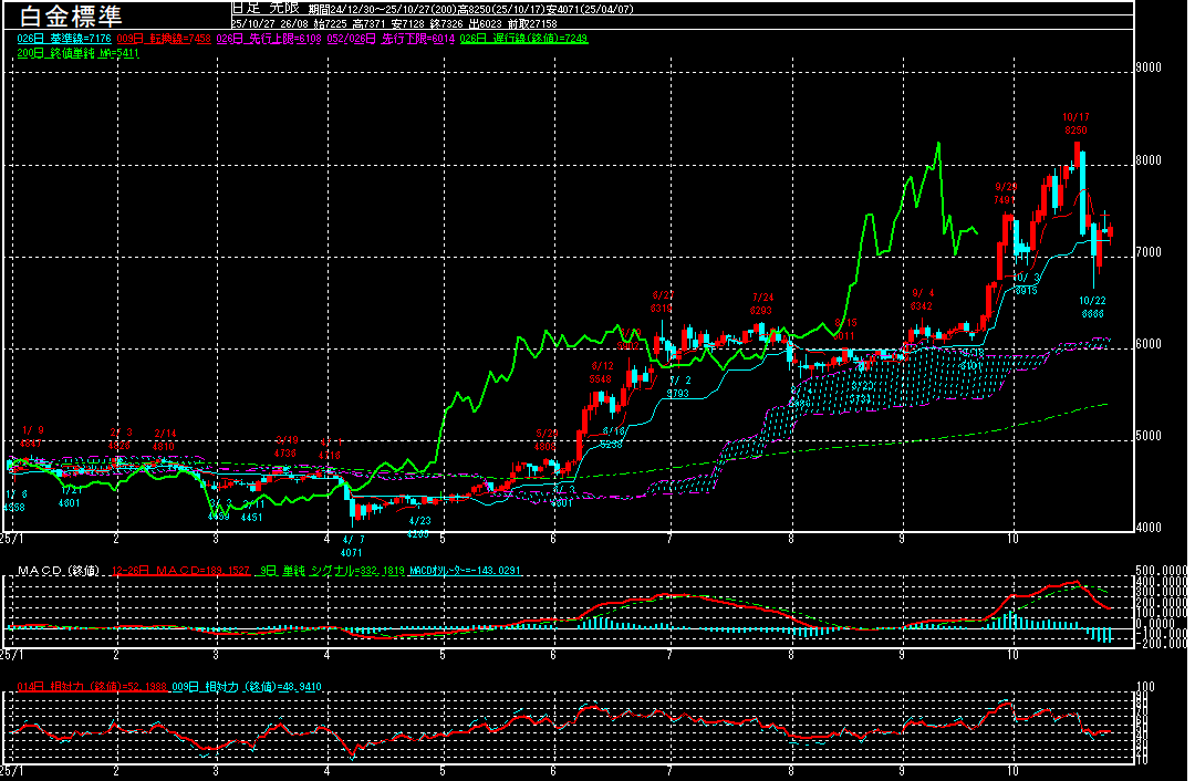 白金標準(期先)は前営業日比183円安の20339円で終了となり、反落。一時20205円まで下げる場面もみられております。20日に大陰線を引いたことで上値の重さが意識され始める中、MACDもデッド・クロスとなったことから、上昇一服感が強まっているようです。