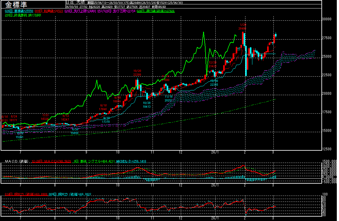 MACDも上昇が一服する中、一目均衡表の雲に入り込んでしまっただけに、目先は2月2日を起点としたアップ・トレンドを維持出来るか注目されます。