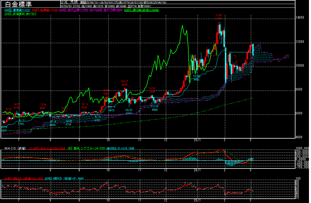 白金標準(期先)は前営業日比919円安の10940円で終了となり、9営業日ぶりに反落。中東の「地政学リスク」が一段と高まり、投資家のリスクオフ姿勢が強まる中、売りが先行。10900円まで下げる場面も見られております。