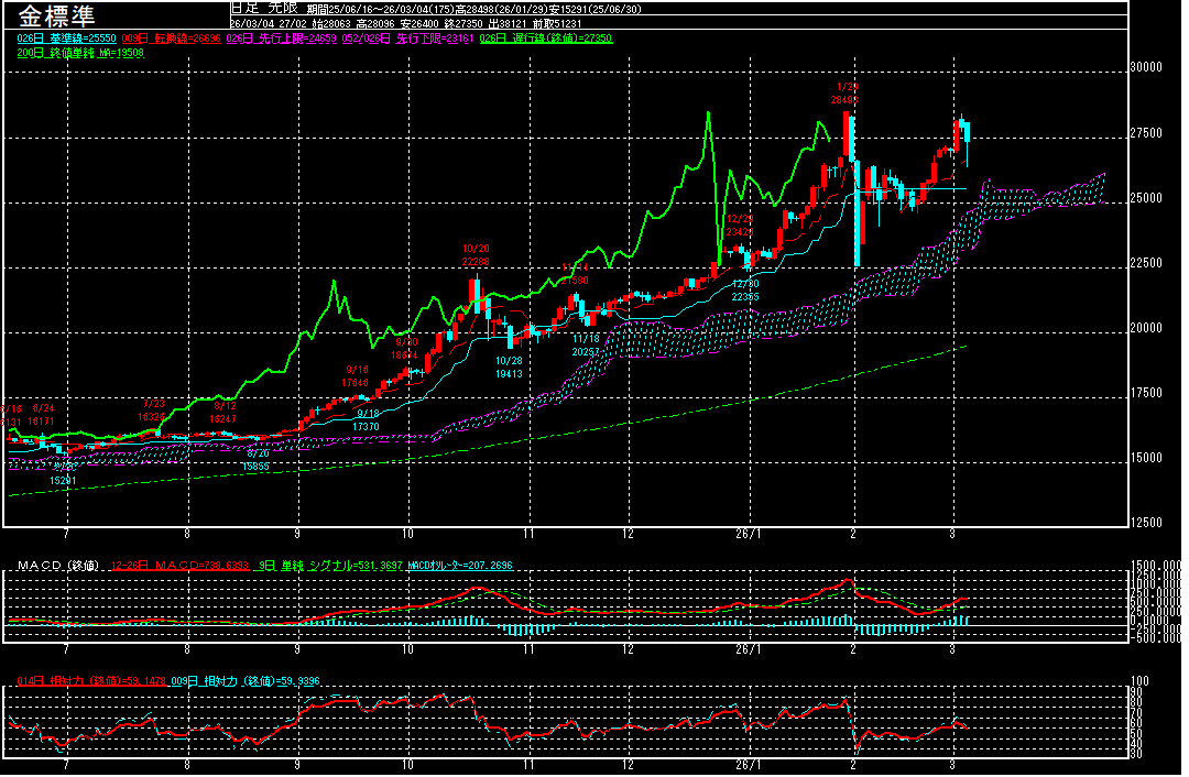 目先は2月2日を起点としたアップ・トレンドをサポートに、2月2日の安値22601円から3月3日の高値28420円の上げ幅をフィボナッチ・リトレースメントで見た場合の38.2%押し水準26197円を維持出来るか注目されます。