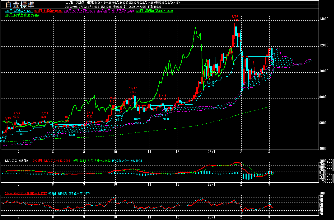 一時9938円まで下げて、2月19日以来の10000円割れとなる場面も見られるも、2月2日の安値8662円から3月2日の高値11983円の上げ幅をフィボナッチ・リトレースメントで見た場合の61.8%押し水準9931円を維持したことから、安値は買い拾われたようです。一目均衡表の雲もサポート・ラインとして意識されたようで、長い下ひげを引いて終了しております。