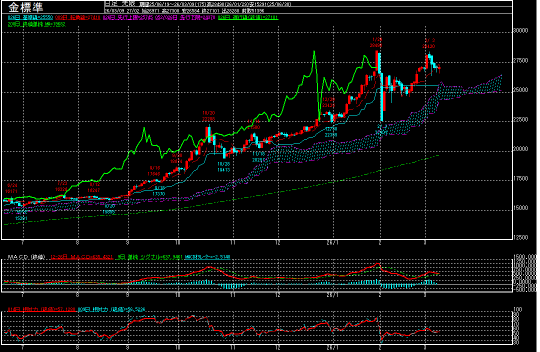 金標準(期先)は前営業日比36円高の27101円で終了となり、続伸。一時26584円まで下げるも、引き続き27000円割れの場面では買い拾う動きが強かったようです。MACDがデッド・クロスとなった上に、上値が段々と重くなってきておりますが、引き続き27000円を維持出来るか注目されます。