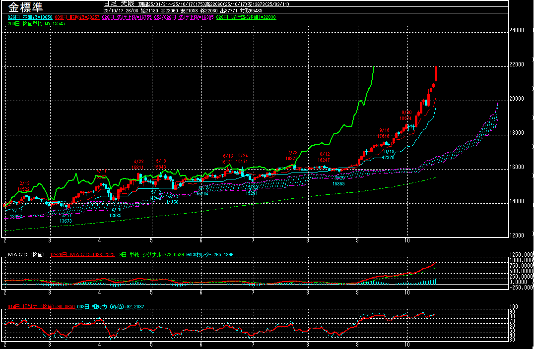 金標準(期先)は前営業日比1019円高の22030円で終了となり、4営業日続伸。前日の高値21047円を上抜いて、22060円まで上昇するなど、連日で最高値を更新。前日に初めて21000円に乗せたのも束の間、本日は初めて22000円台に乗せてきております。