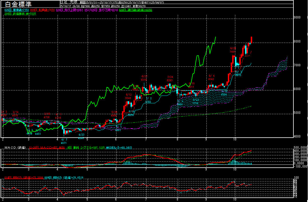 白金標準(期先)は前営業日比300円高の8250円で終了となり、反発。前日の高値8045円を上抜いて8250円まで上昇するなど、終値でも8000円台に乗せてきております。