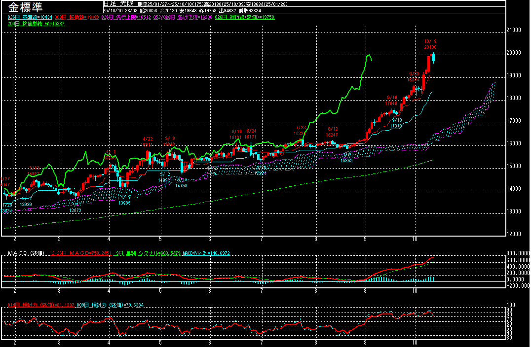 金標準(期先)は前営業日比283円安の19758円で終了。5営業日ぶりに反落となりました。円高基調が強まったことに加えて、テクニカル的に相対力指数(RSI)は90%台で推移する中、買われ過ぎ感が意識されたようです。19648円まで下げる場面もみられております。