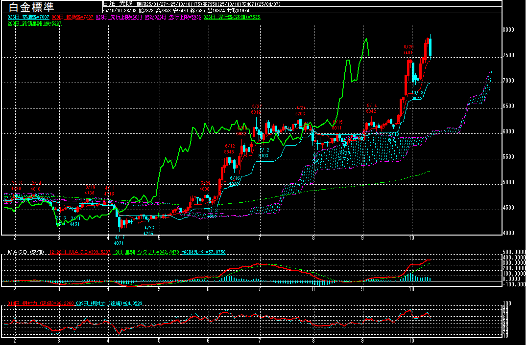 MACDの上昇が一服する中、10月3日の安値6915円から10月10日の高値7958円の上げ幅をフィボナッチ・リトレースメントで見た場合の38.2%押し水準7560円を割り込みつつありますが、相対力数(RSI)が70%を割り込むなど、指数の調整が進んでいるだけに、安値は引き続き買い拾われそうです。