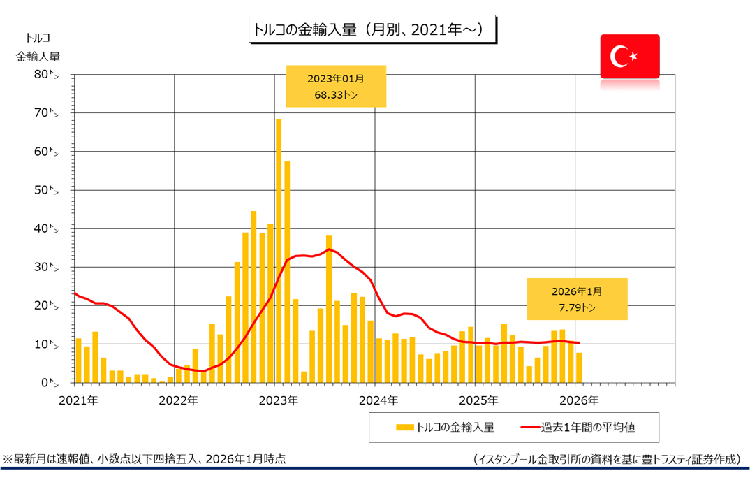 イタンブール金取引所の統計によると、1月トルコ金輸入量は前年同月比19.3%減少の7.79トンでした。2ヶ月連続でマイナスとなり、昨年8月(6.50トン)以来の低水準となっております。