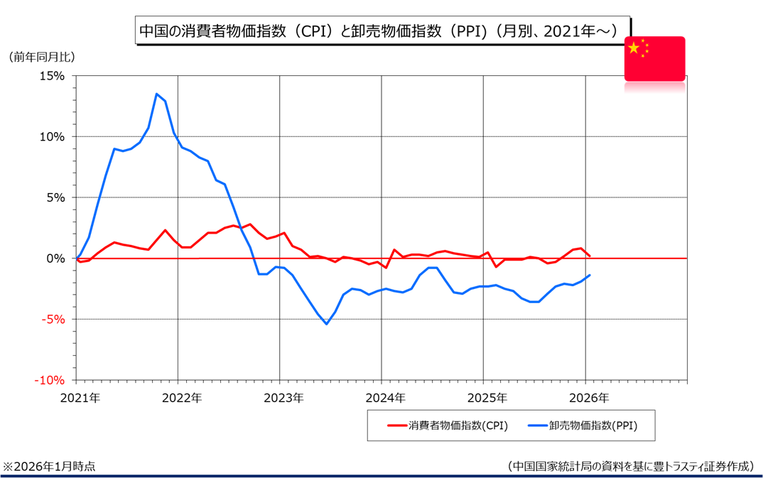 同時に発表された1月中国卸売物価指数(PPI)は同1.4%低下。下落率は前月(1.9%低下)から縮小したものの、40ヶ月連続で低下しております。