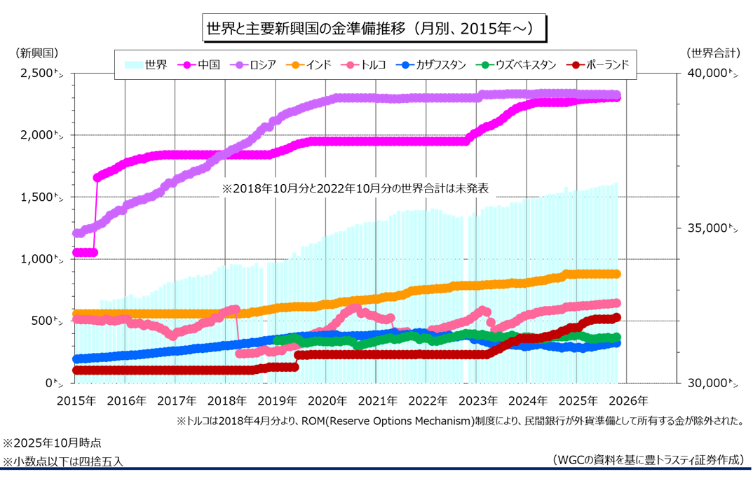 国別にみると、主要国では中国は同0.9トン増と、12ヶ月連続で増加。ロシアは同3.1トン減少。インドは前月から変わらず。トルコは同3.0トン増と、10ヶ月連続で増加。カザフスタンは同0.6トン増と、8ヶ月連続で増加。ウズベキスタンは同9.4トン増となっております。