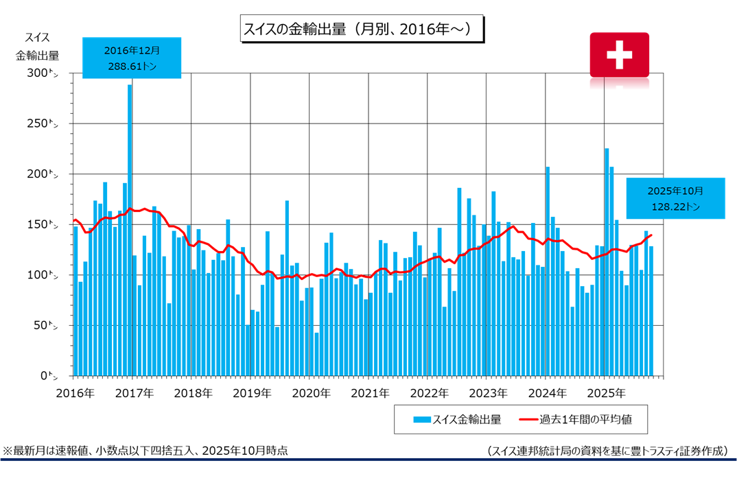 スイス連邦統計局によると、10月スイス金輸出量(速報値)は前年同月比42.1%増加の128.22トンと、5ヶ月連続でプラスとなりました。ただ、3月(154.44トン)以来6ヶ月ぶり高水準となった前月(143.54トン)は下回っております。2025年1-10月期累計では前年同期比20.6%増加の1416.19トン。ドル建て金価格が最高値を更新する中でも、需要期を控えて輸出が伸びた国が多かったようです。