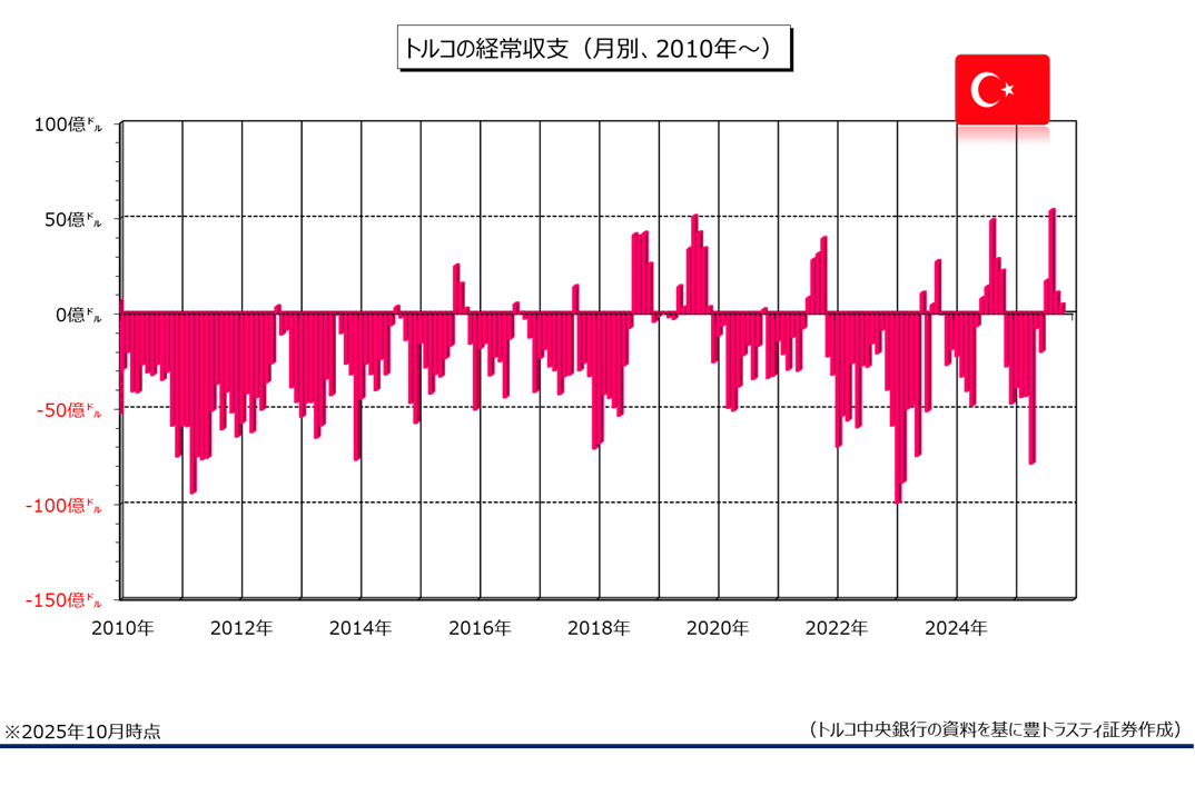 トルコ統計局が12月12日に発表した10月トルコ経常収支は4億5700万ドルの黒字でした。4ヶ月連続で黒字となったものの、前年同月(22億2500万ドルの黒字)は下回っております(前月は104億7800万ドルの黒字)。