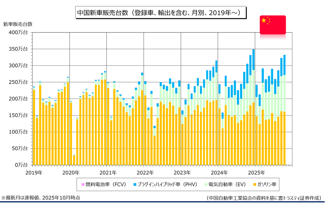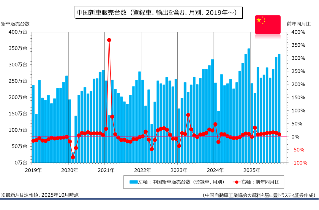 中国の自動車業界団体、中国汽車工業協会11月11日に発表した10月中国新車販売台数(輸出含む)は、前年同月比8.8%増加の332万2094台と、9ヶ月連続でプラスとなりました。2025年1-10月期累計では前年同期比12.3%増の2764万6479台。
